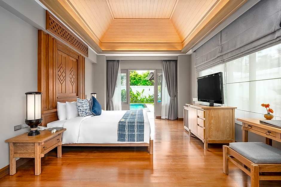 Spacious villa with a private plunge pool, gazebo and outdoor terrace. Includes a rain shower, sound system with CD/DVD player, and a seating area with sofa.